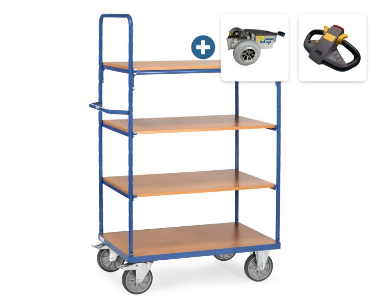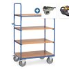 Opbouwsysteem: van stalen buis en gelast profielstaal, gepoedercoat blauw RAL 5007, schroefconstructie. Kopwanden open. 1 Vaste en 3 verstelbare etages van houten plaat, toplaag beukendecor. Etages variabel instelbaar, verdeling 100 mm. Draagvermogen per etage 90 kg.