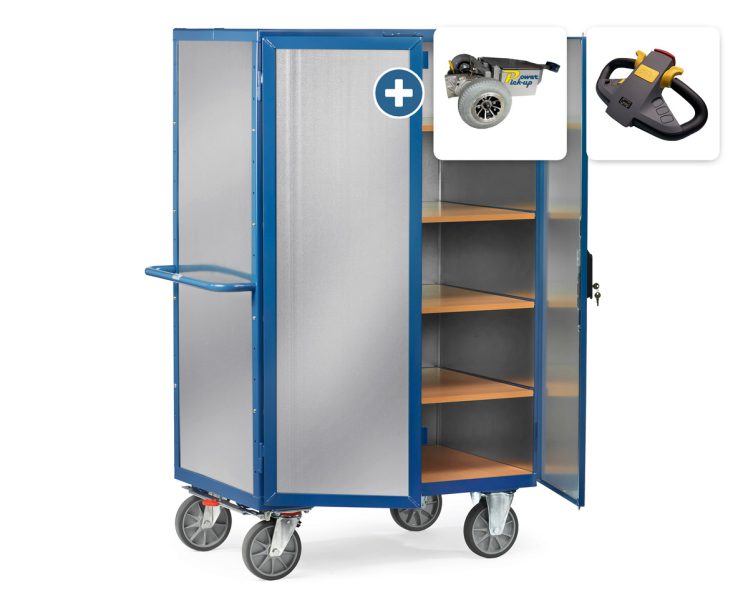 Profielstalen constructie met duwbeugel, gepoedercoat. Kopwanden, zijwanden, vleugeldeuren en dak met staal plaat 1,5 mm dik. Dubbele vleugeldeuren van profielstaal met spanjoletsluiting, zwenkhendel en ingebouwd cilinderslot. 1 Vaste en 4 losse etages. Etages van solide, buigstijve sandwichplaten, toplaag beukendecor. Draagvermogen per etage 90 kg.