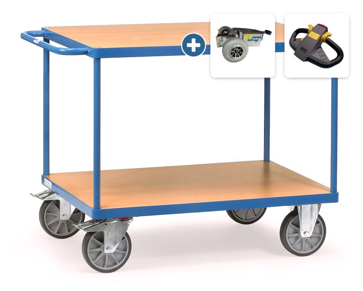 Stalen buis en gelast profielstaal, gepoedercoat RAL 5007. 2 Platformen van houten plaat, toplaag beukendecor.